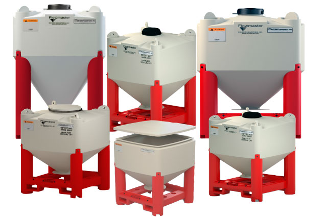 Steel and plastic hopper bin designs are available with a variety of options and sizes to meet the unique handling requirements of dry powder and granular materials. Dry handling bins can be configured with different slopes, discharge/fill openings, and valves, and Snyder offers a full line of accessories, including discharge stands, tumblers, and filling stations designed to optimize material flow.